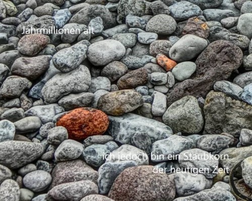 Neben der Bildhauerei beschäftige ich mich gerne mit der Verbindung von Fotografie und Poesie. Poetische Gedanken und Bildmotive ergänzen sich dabei in einem Zusammenspiel, sie passen zueinander, ohne sich zu entsprechen. Reizvoll ist es aber auch, wenn Schrift und Bild in Kontrast zueinander stehen und den Betrachter zu seiner eigenen Sichtweise anregen.